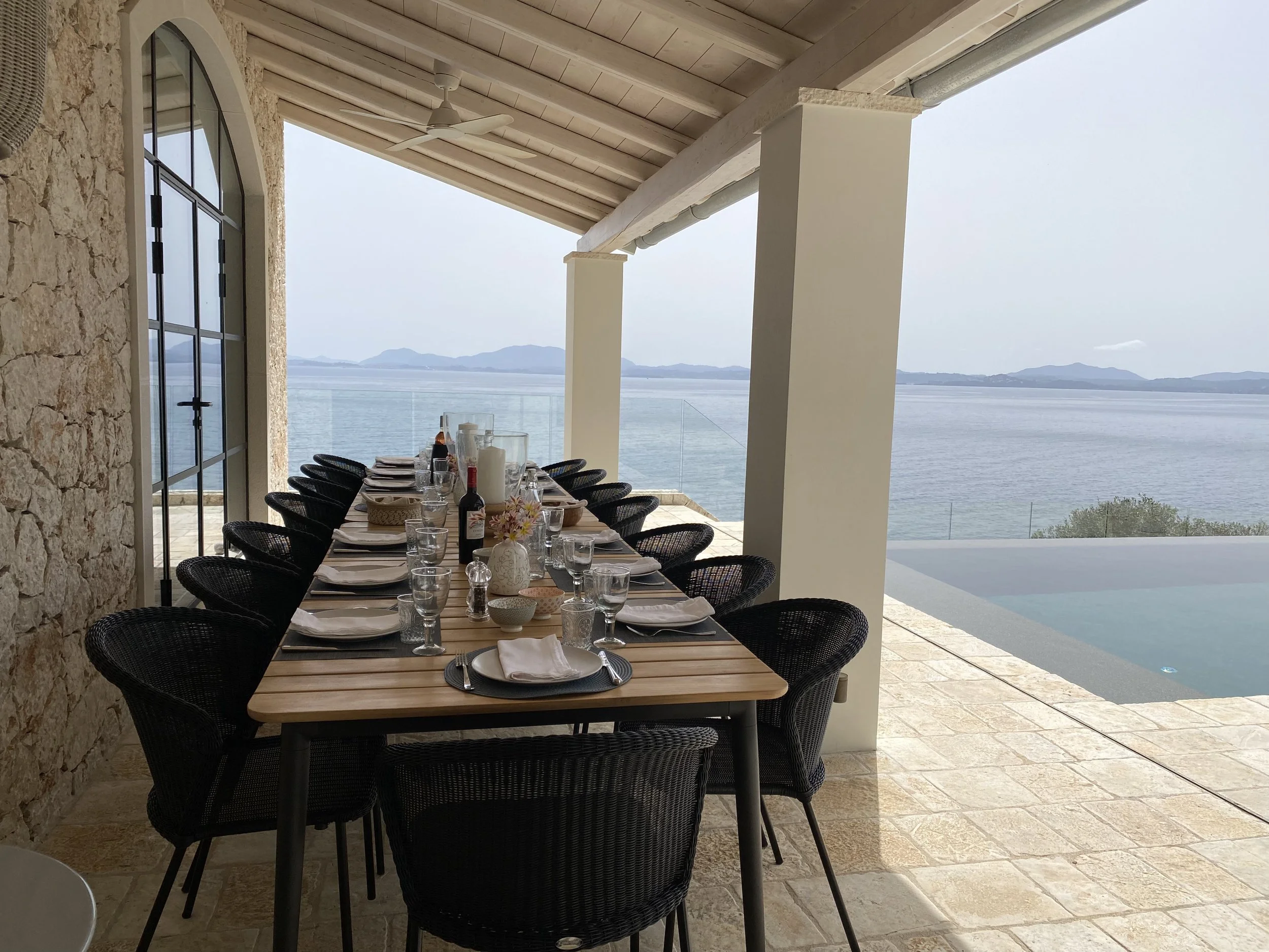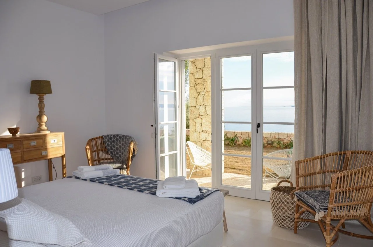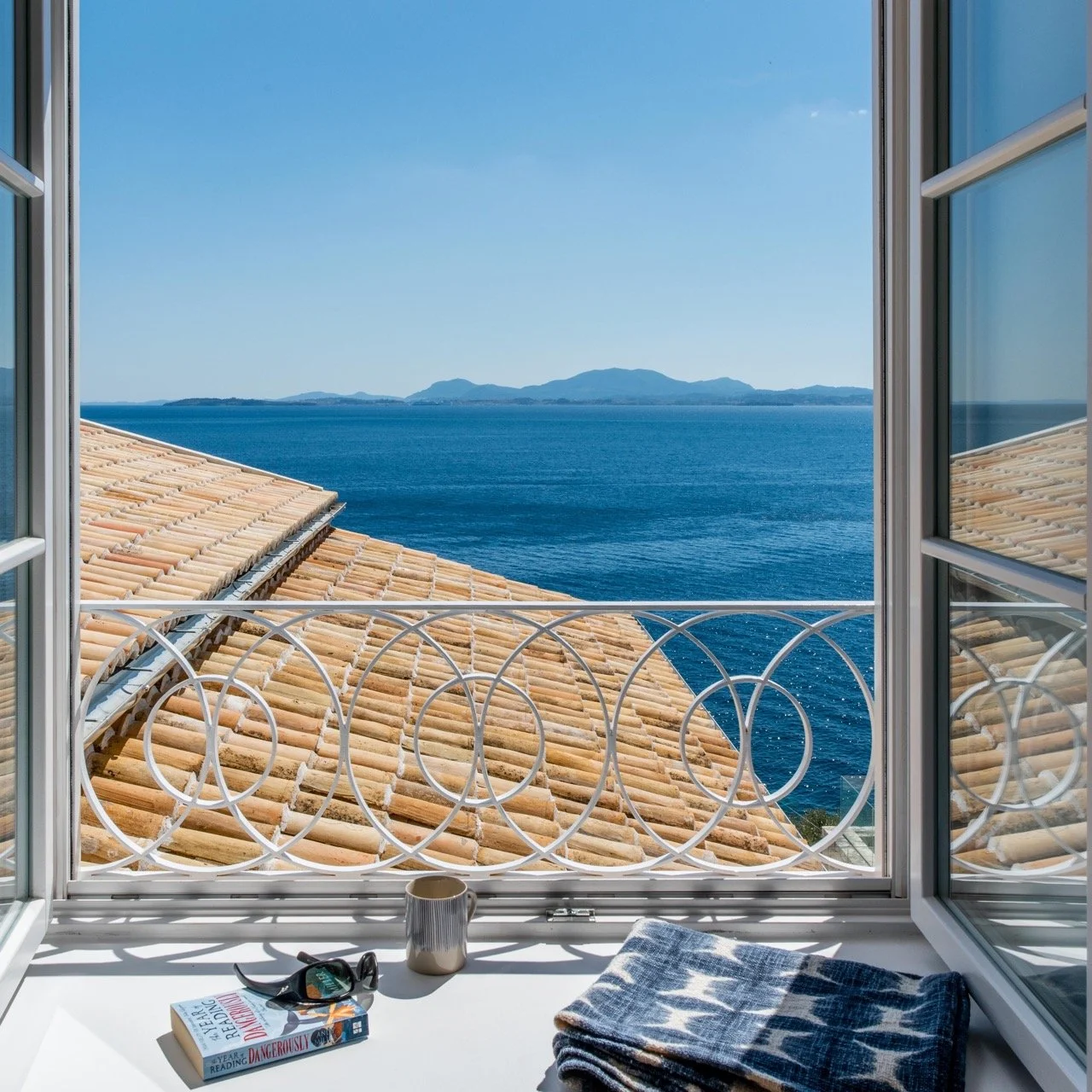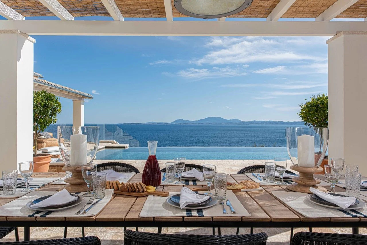 From its position on the hillside, the house commands spectacular views sweeping around from the south to the west, and east over the water to the coast of Albania and the nearby headlands set in a sea of jade green and turquoise.