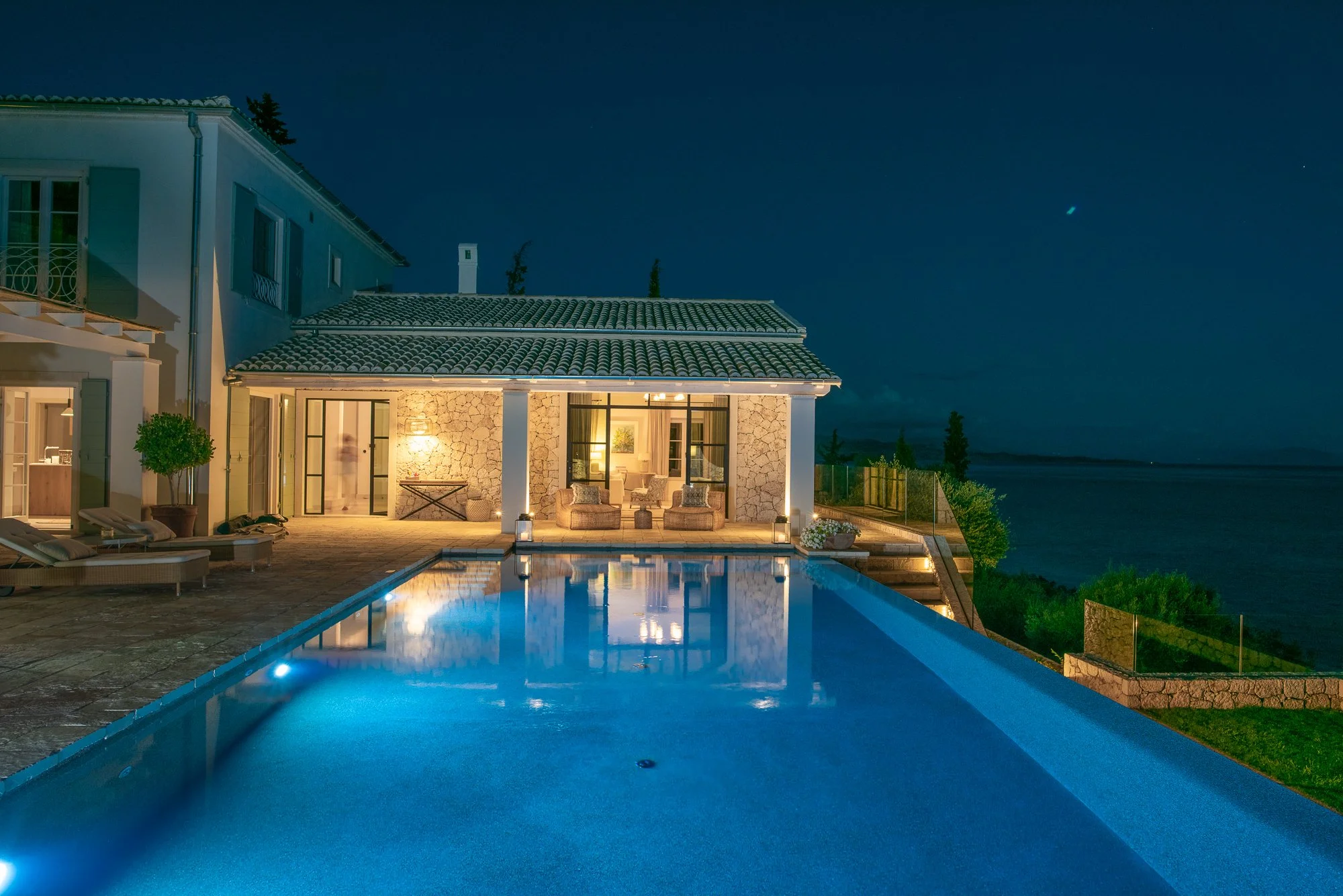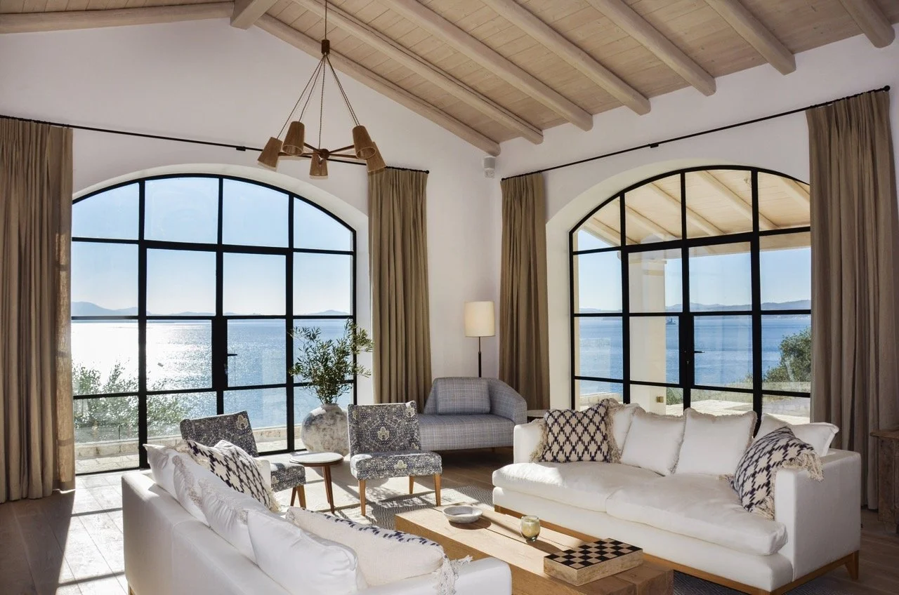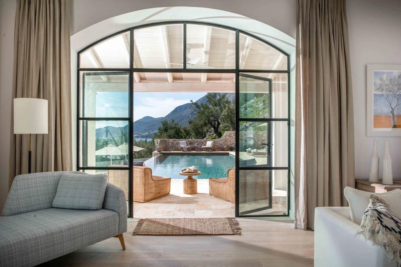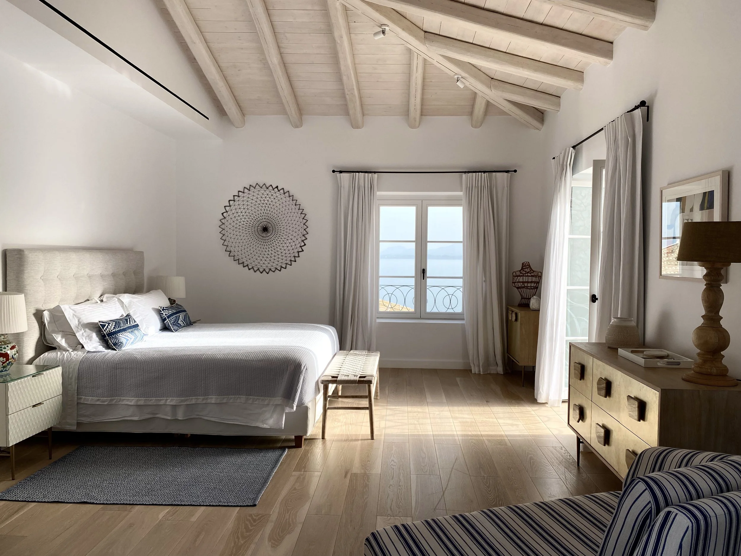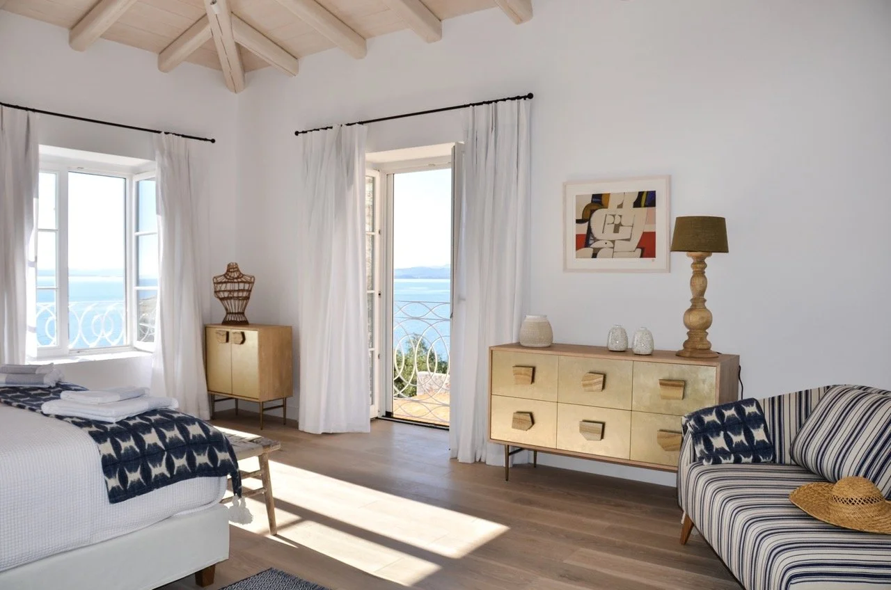 From its position on the hillside, the house commands spectacular views sweeping around from the south to the west, and east over the water to the coast of Albania and the nearby headlands set in a sea of jade green and turquoise.