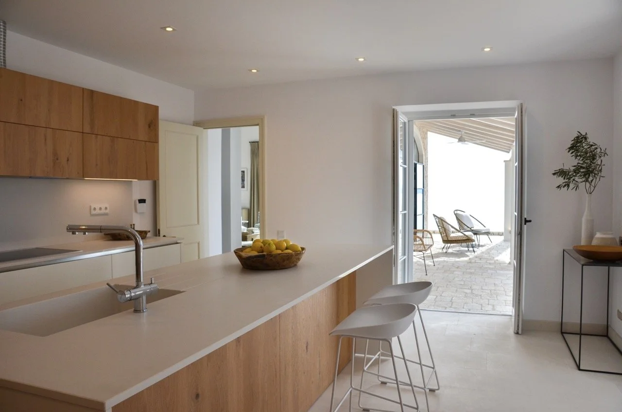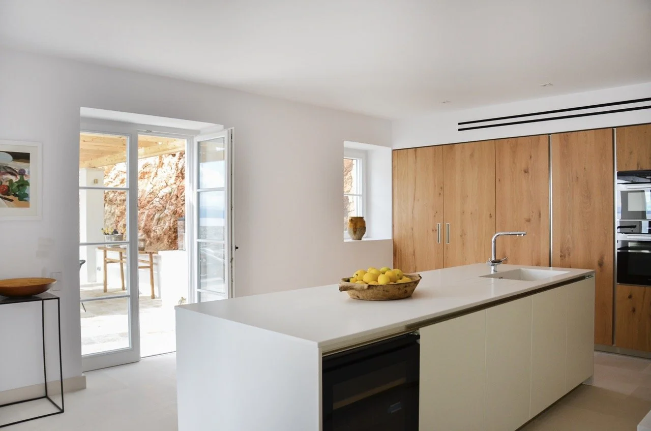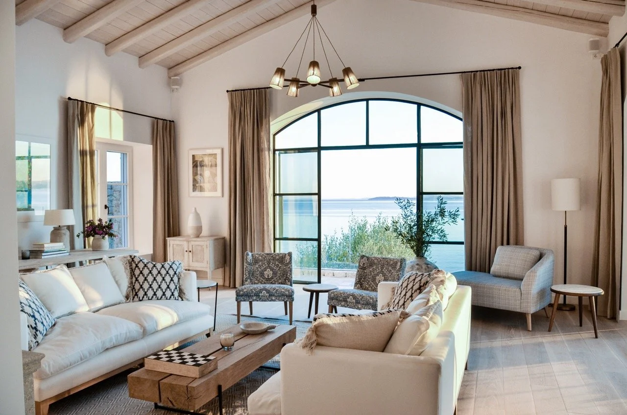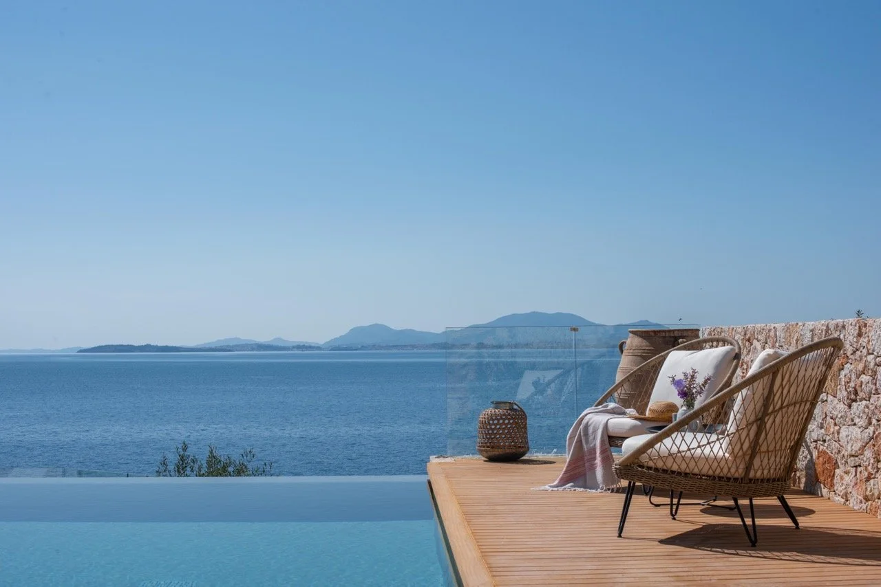 From its position on the hillside, the house commands spectacular views sweeping around from the south to the west, and east over the water to the coast of Albania and the nearby headlands set in a sea of jade green and turquoise.
