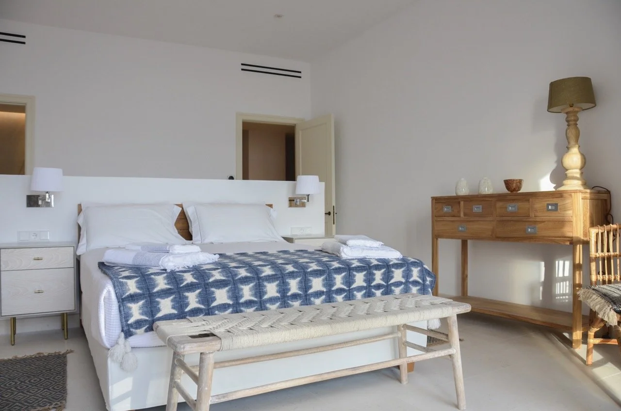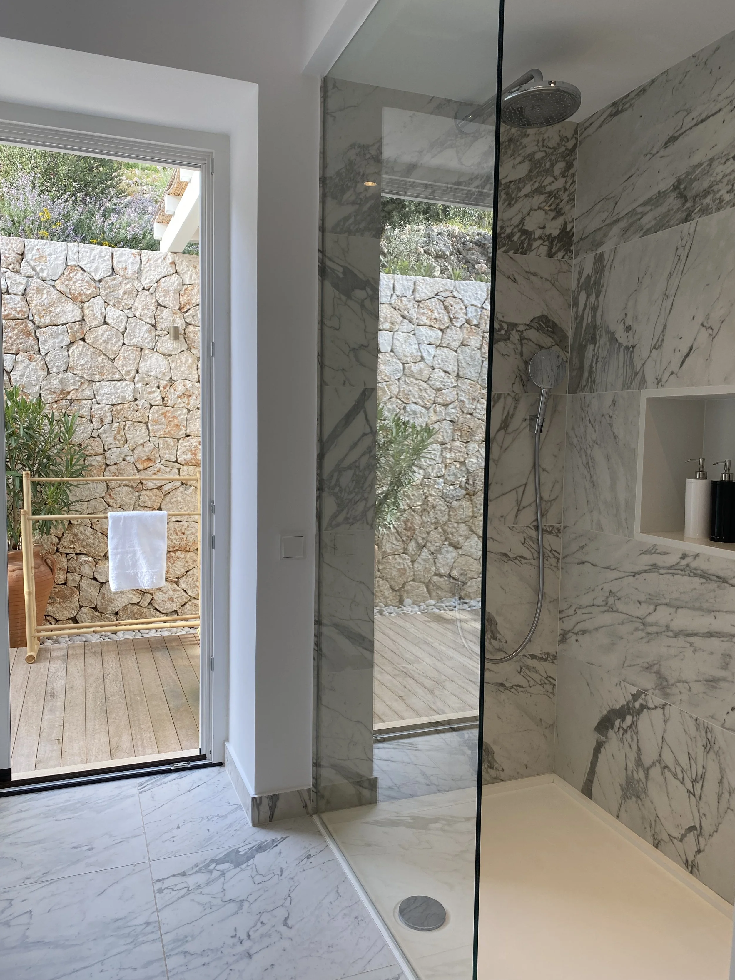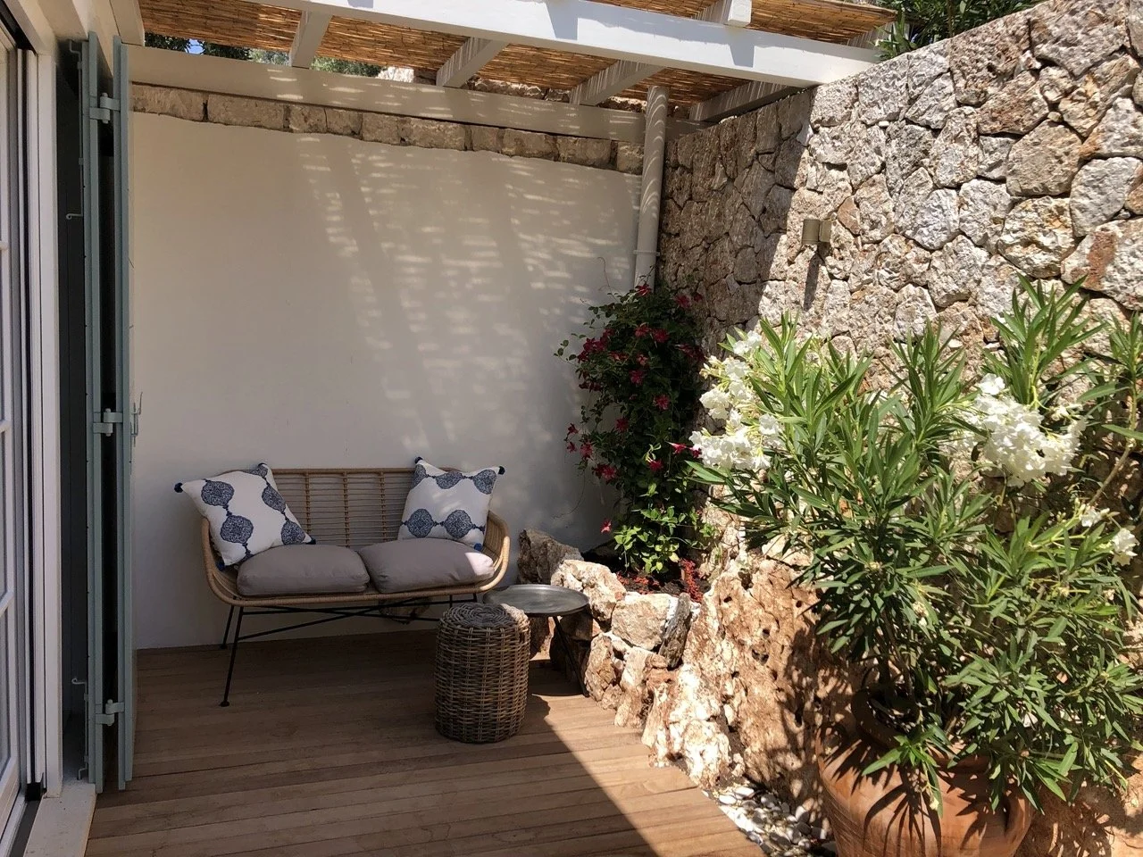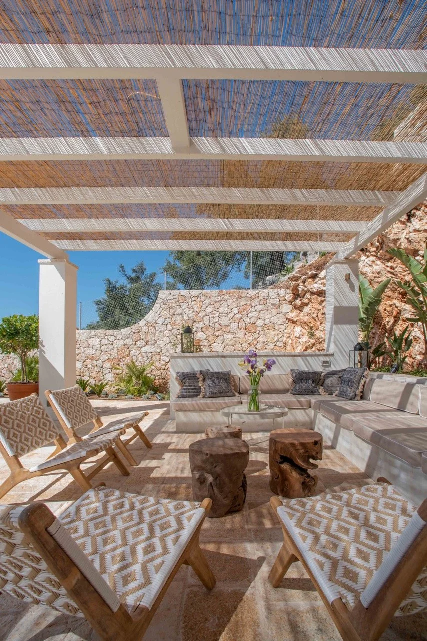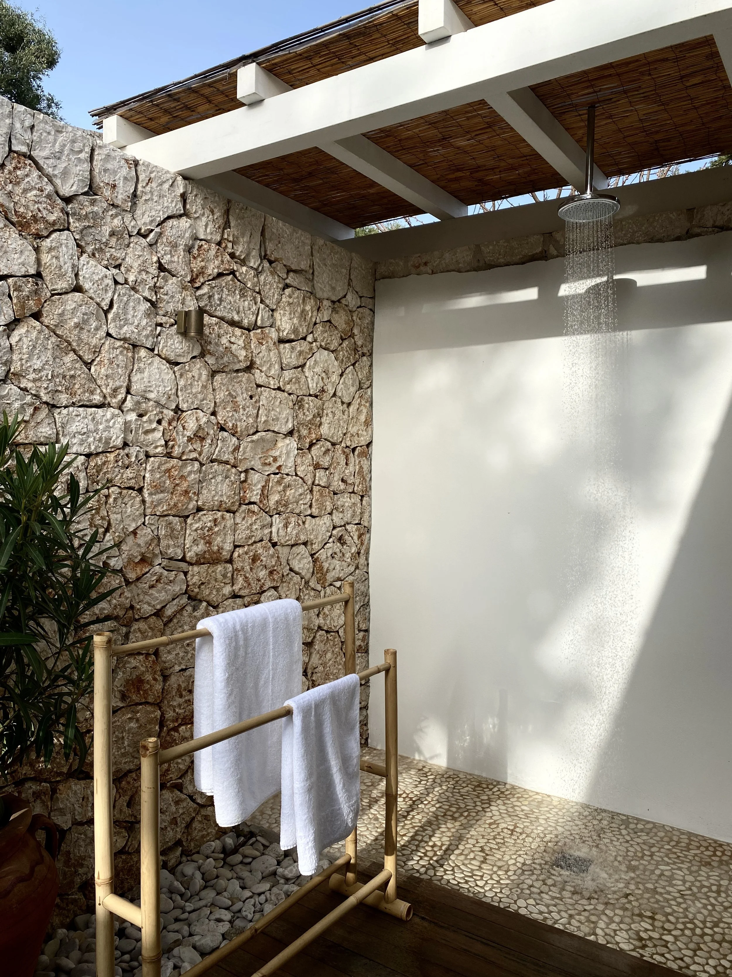Descending through the garden there is another seating area under olive trees, facing west where one can watch the sunset, known as the ouzo terrace. This leads to the beach where there is a further outdoor terrace with a cane-roofed pergola, with stone dining table for 8, a rain shower and changing room/WC, and a small kitchen area with a fridge.