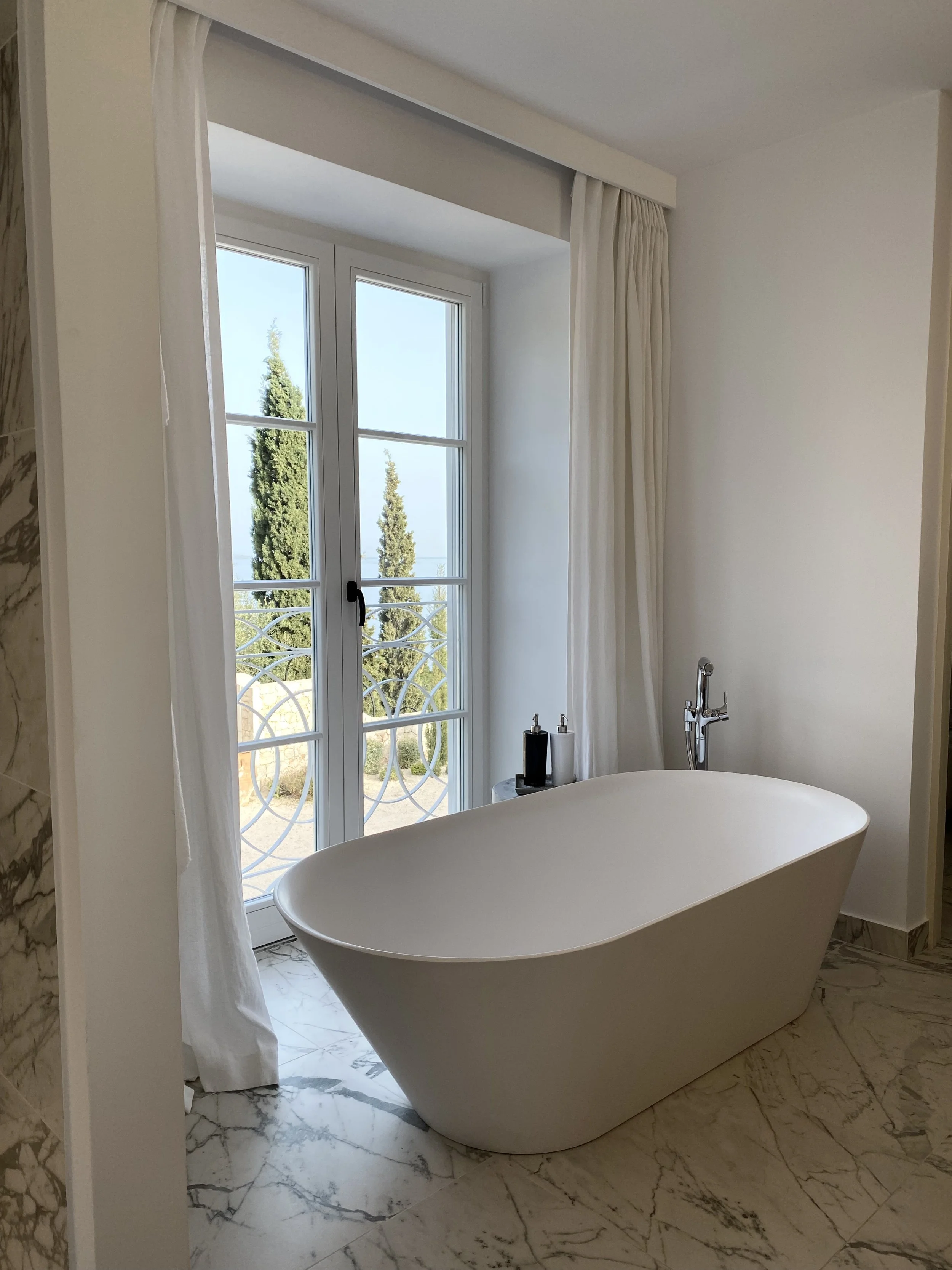 The master bedroom occupies the entire top floor and has views to the south through a window and west through balcony doors and boasts a king-size bed and en suite bathroom, with a wonderful freestanding bath and an outside private patio with shower.